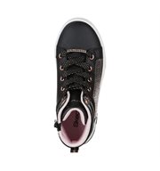 Give her sleek fashionable style with glittering glamour in the SKECHERS Shoutouts - Sparkle & Style shoe. Smooth synthetic upper in a lace up casual high top sneaker with mini rhinestone side panel, stitching and overlay accents.