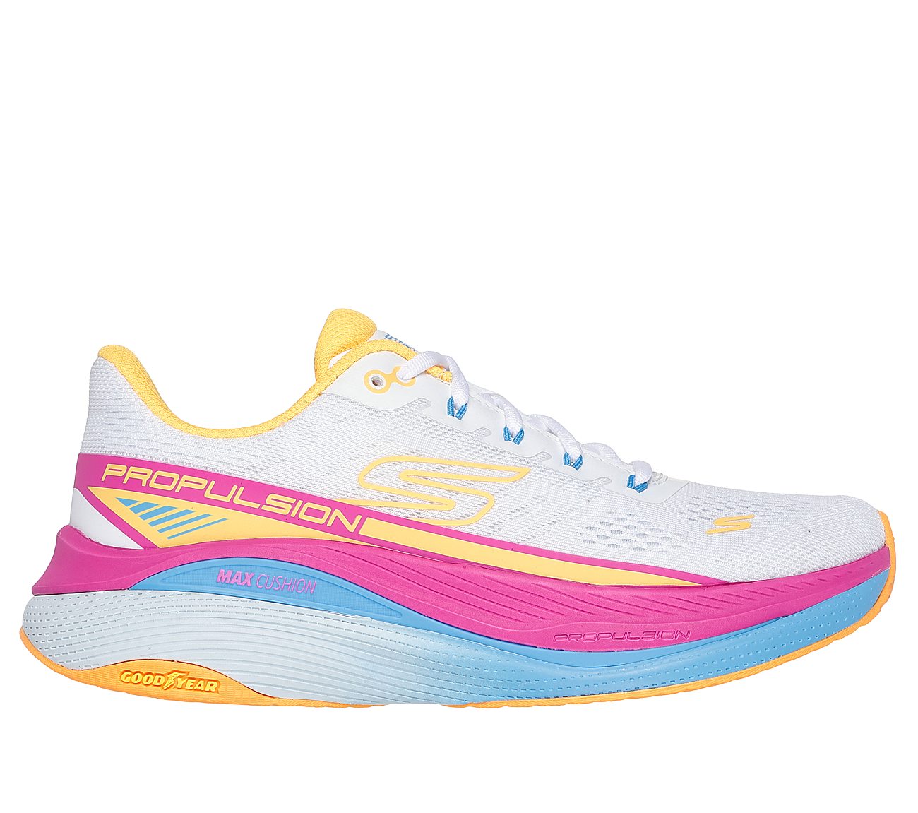 Elevate your performance in ultimate comfort wearing Skechers Max Cushioning® Propulsion. Crafted with recycled materials, this vegan running style features an engineered mesh upper with a Skechers Air-Cooled Goga Mat™ insole, an exceptionally comfortable Max Cushioning® midsole with responsive TPU plate, and an anti-slip Goodyear® Rubber outsole. Our Planet Matters®: Good for your feet. Good for the world.®
