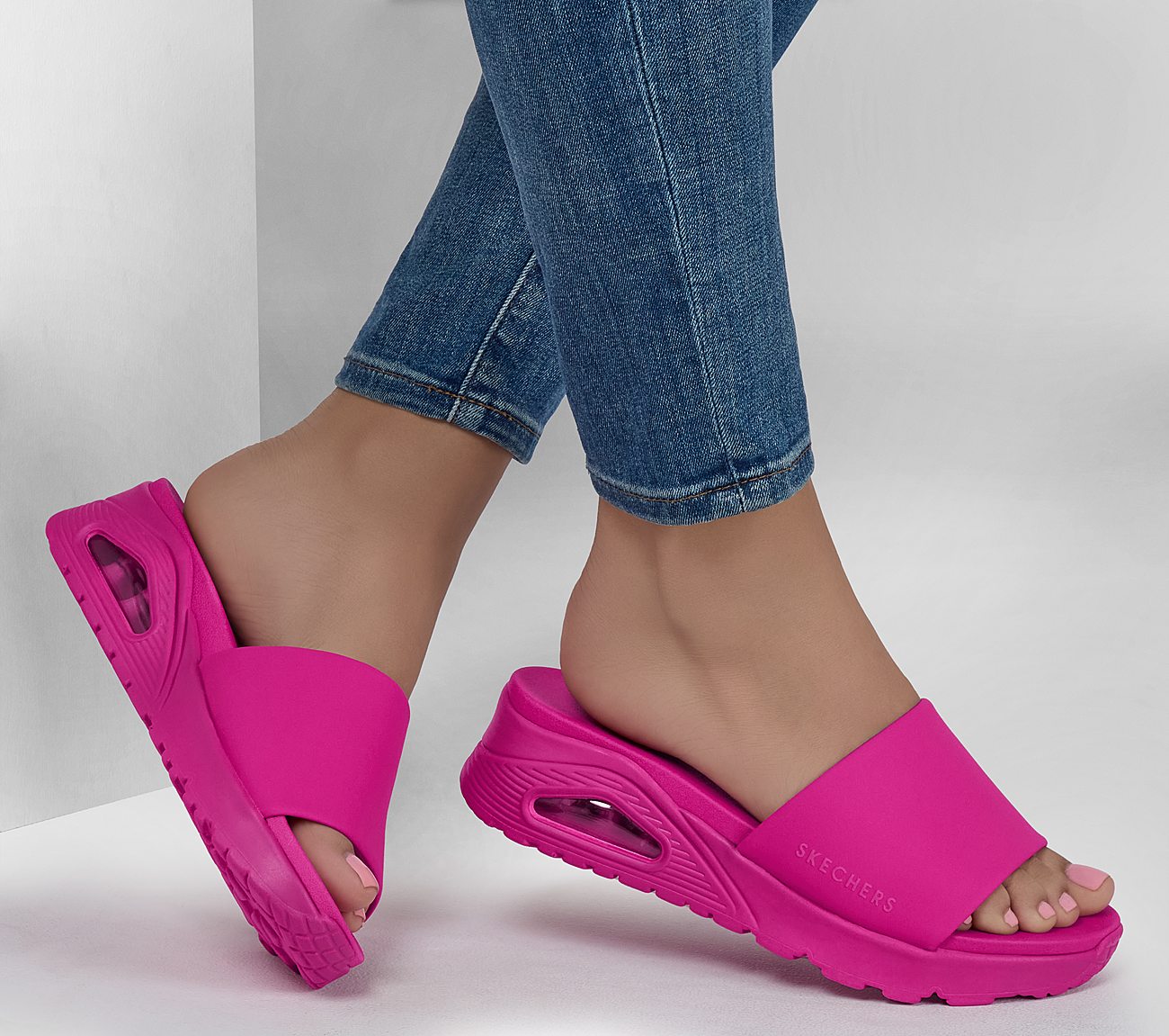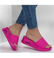 Heat up the season with style in Skechers Uno - Stand Together. This vegan slide sandal inspired from our iconic Uno silhouette features a synthetic band strap upper. This design is complete with a cushioned Yoga Foam® footbed and visible Skech-Air® airbag midsole.