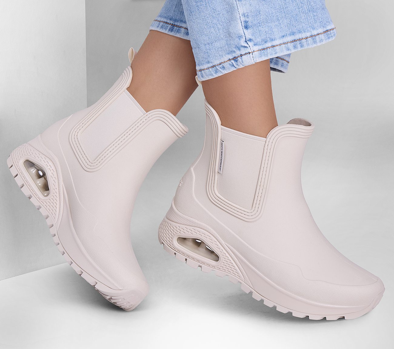 Get iconic style and comfort rain or shine with Skechers Street™ Uno Rugged - Dancing N The Rain. This fashion rain boot features a waterproof synthetic upper with a cushioned Skechers Air-Cooled Memory Foam® insole, and a Skech-Air® visible airbag midsole.