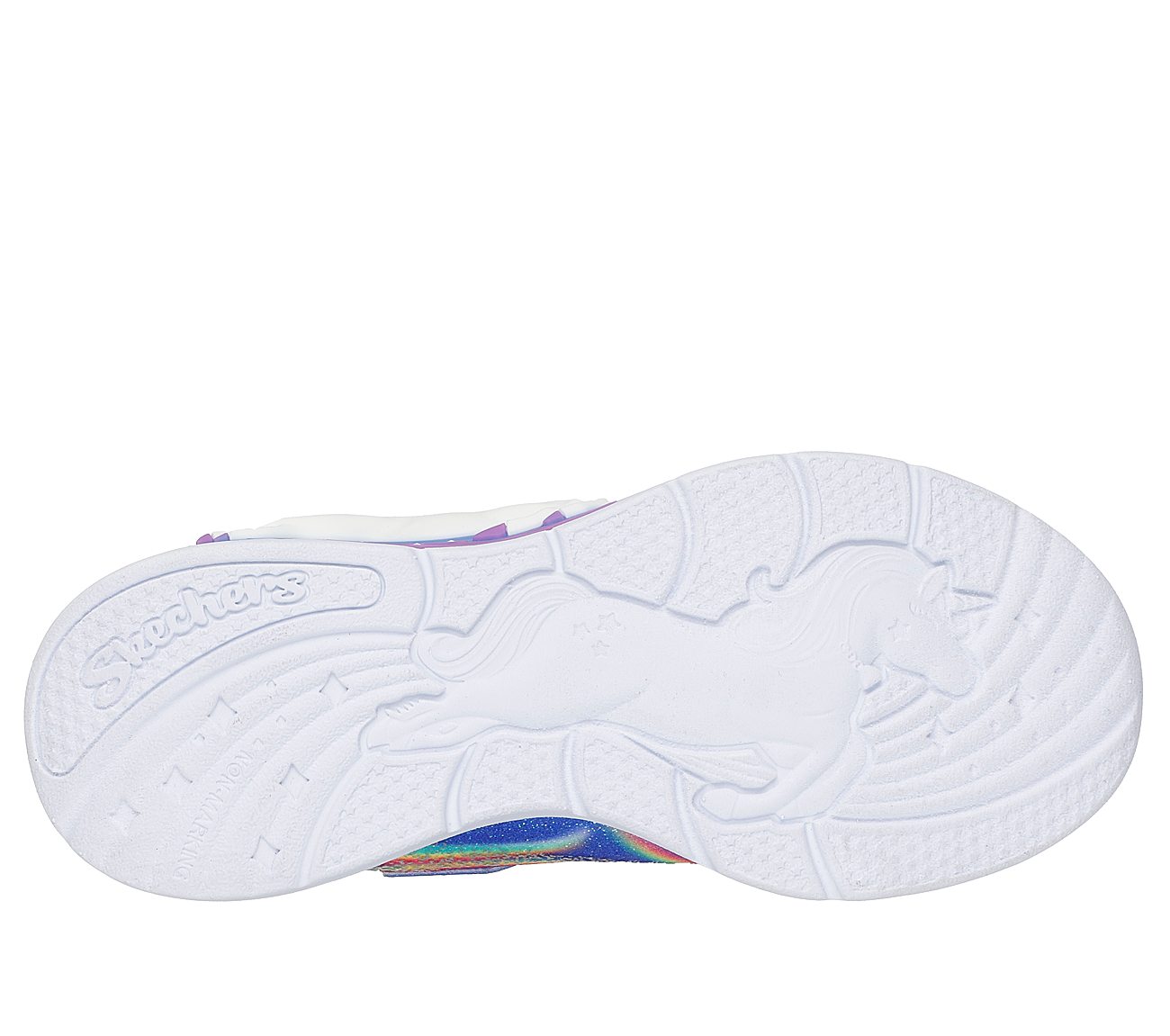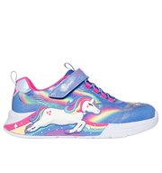 Sparkle and shine in style wearing Skechers S-Lights® Unicorn Chaser. This sporty Magical Collection® lighted design features a synthetic glitter finish upper with unicorn and rainbow side graphic, stretch laces, adjustable instep strap, and a cushioned comfort footbed. Bonus gift with purchase.