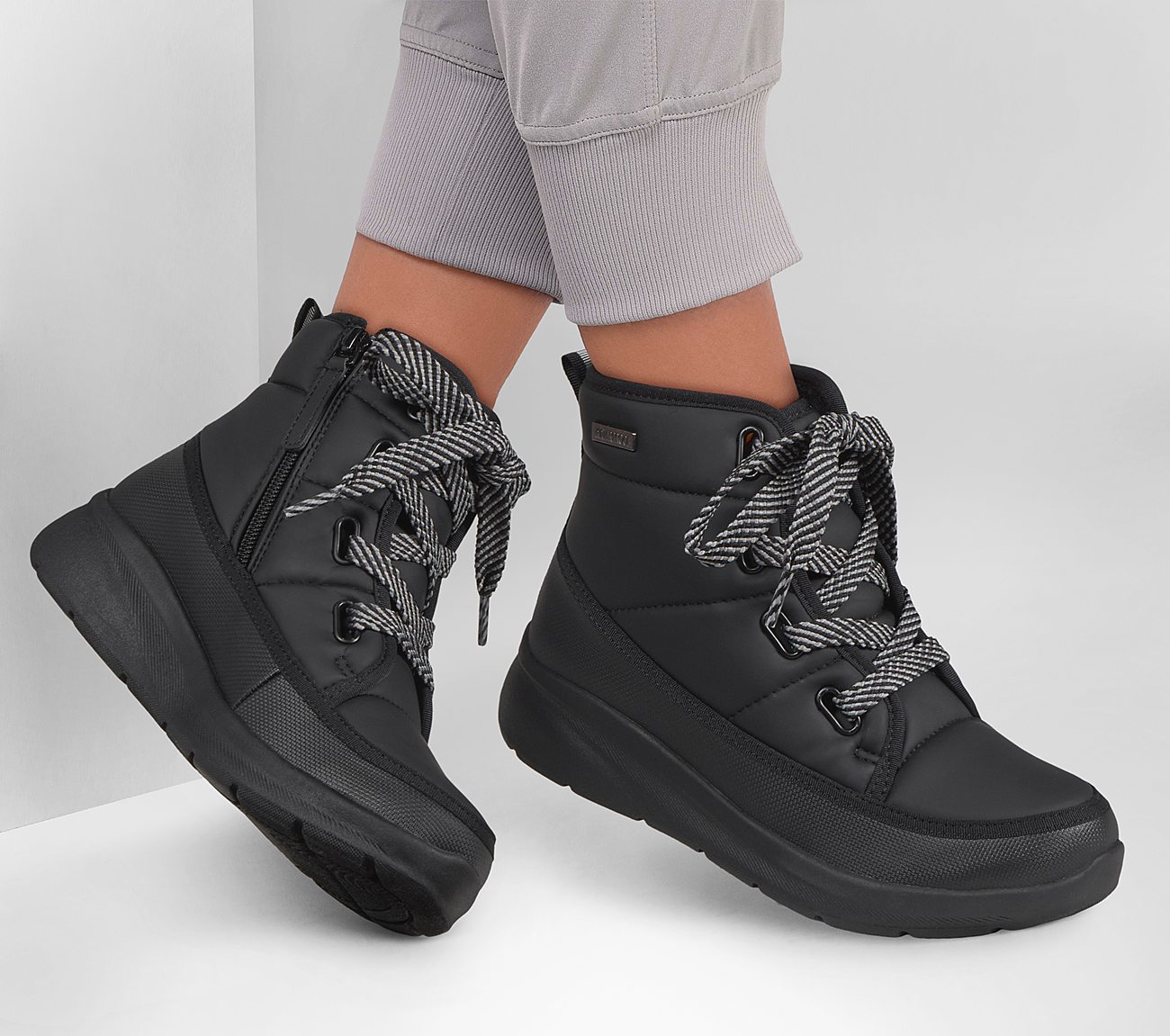 Embrace the elements in signature comfort with the waterproof Skechers Relaxed Fit: Tahoe. This lace-up puffer style boot features a synthetic upper with chenille lining, side zip closure, and a cushioned Skechers Memory Foam™ comfort insole.