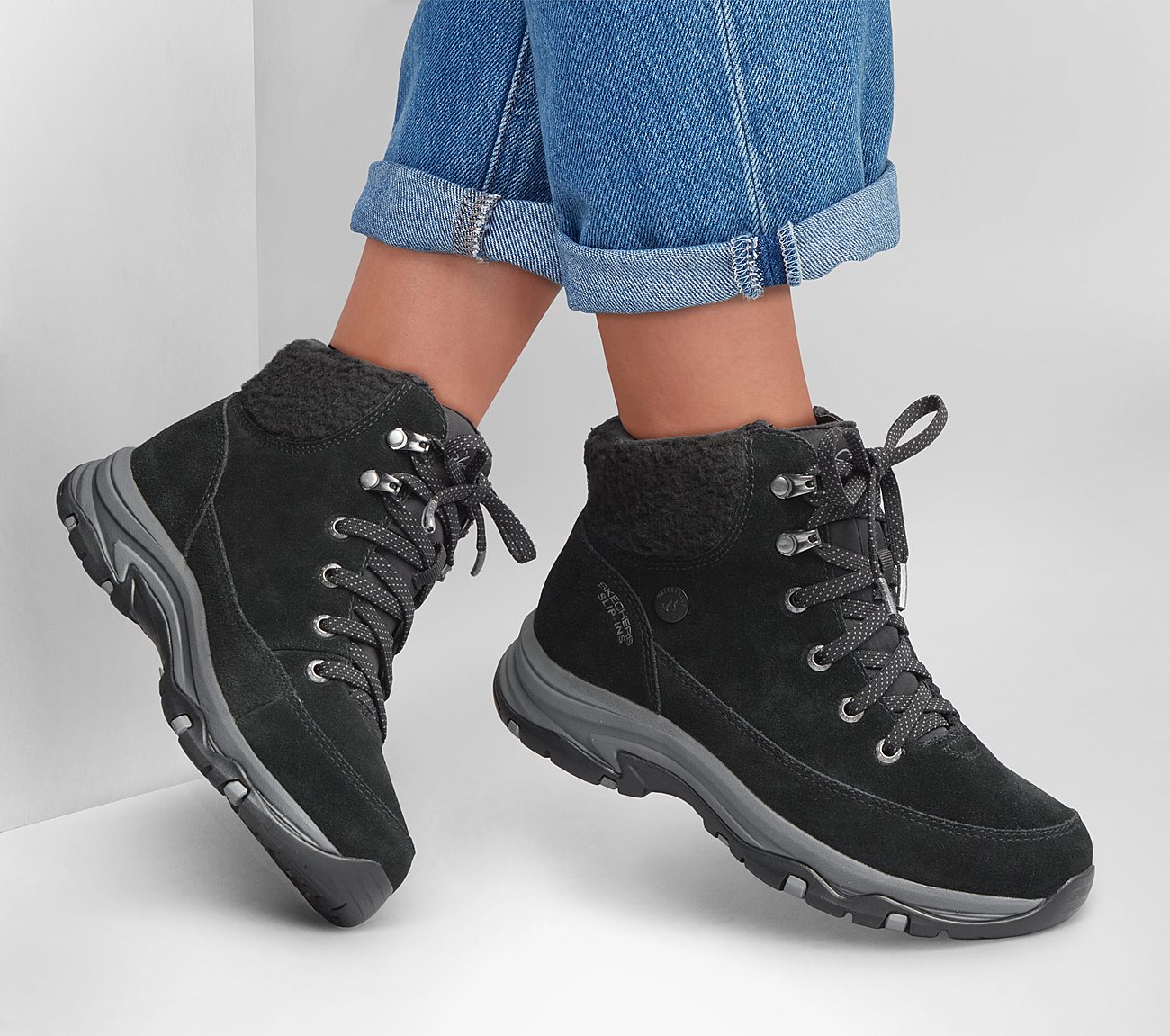 Take the winter on in stylish comfort with Skechers Hands Free Slip-ins® Relaxed Fit®: Trego - Snow Breeze. Designed with our Heel Pillow®, this waterproof slip-on trail boot features a roomy genuine suede upper with a faux shearling collar and lining, adjustable laces, and a cushioned Skechers Memory Foam™ insole.