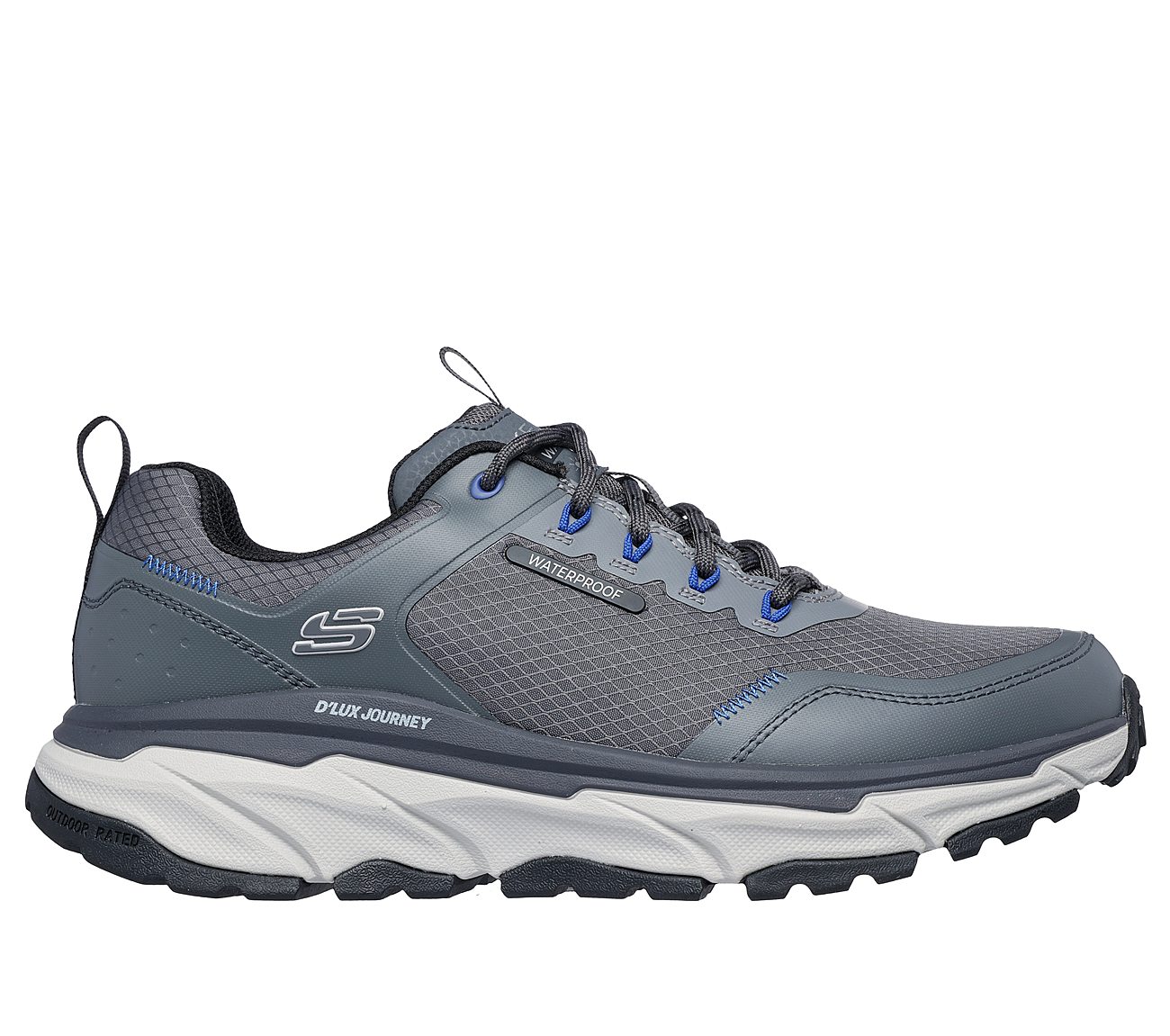 Lace-up for outdoor adventures in comfort and style with Skechers Relaxed Fit®: D'Lux Journey - Slate Peak. This rugged vegan style features a roomy ribstop and hotmelt overlay upper with a lace-up front, a cushioned Air-Cooled Memory Foam® insole, and Skechers Breathe Easy Technology™ to help keep your feet dry.