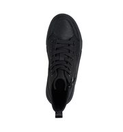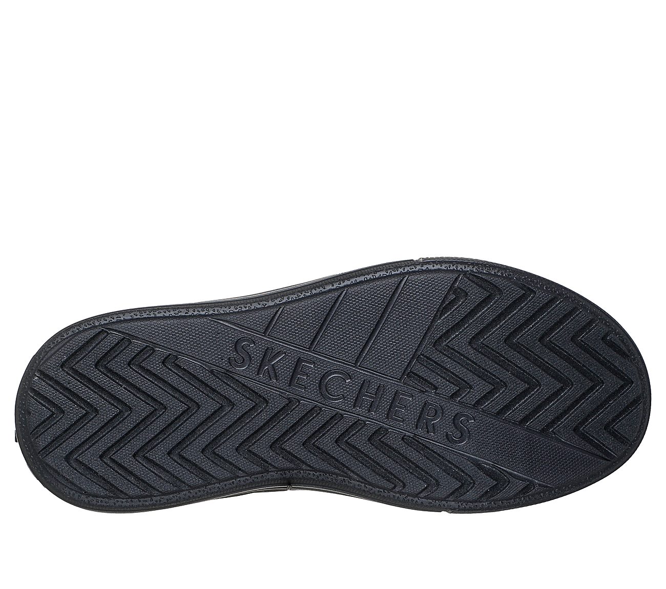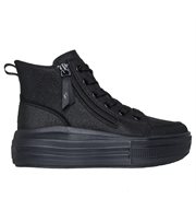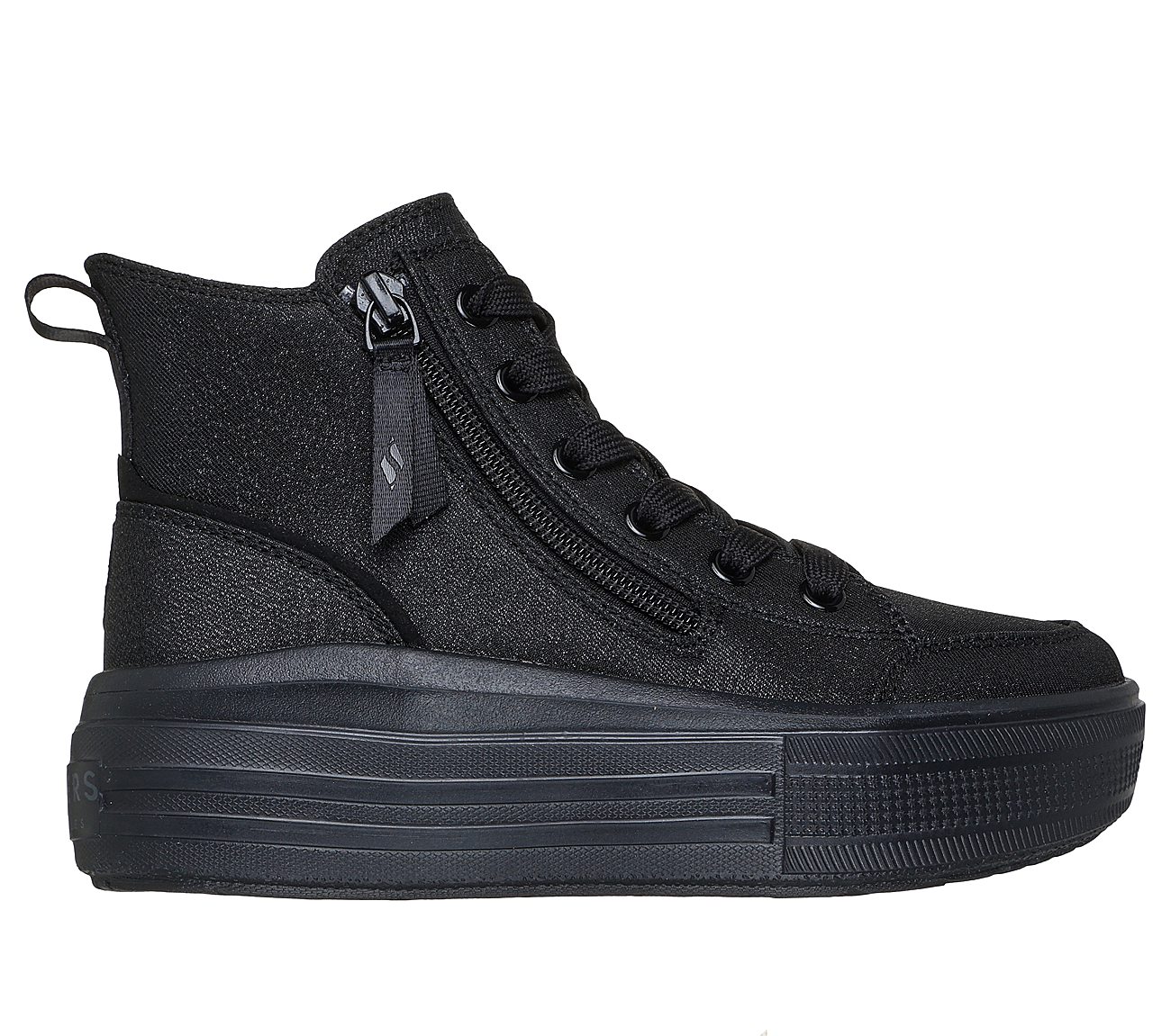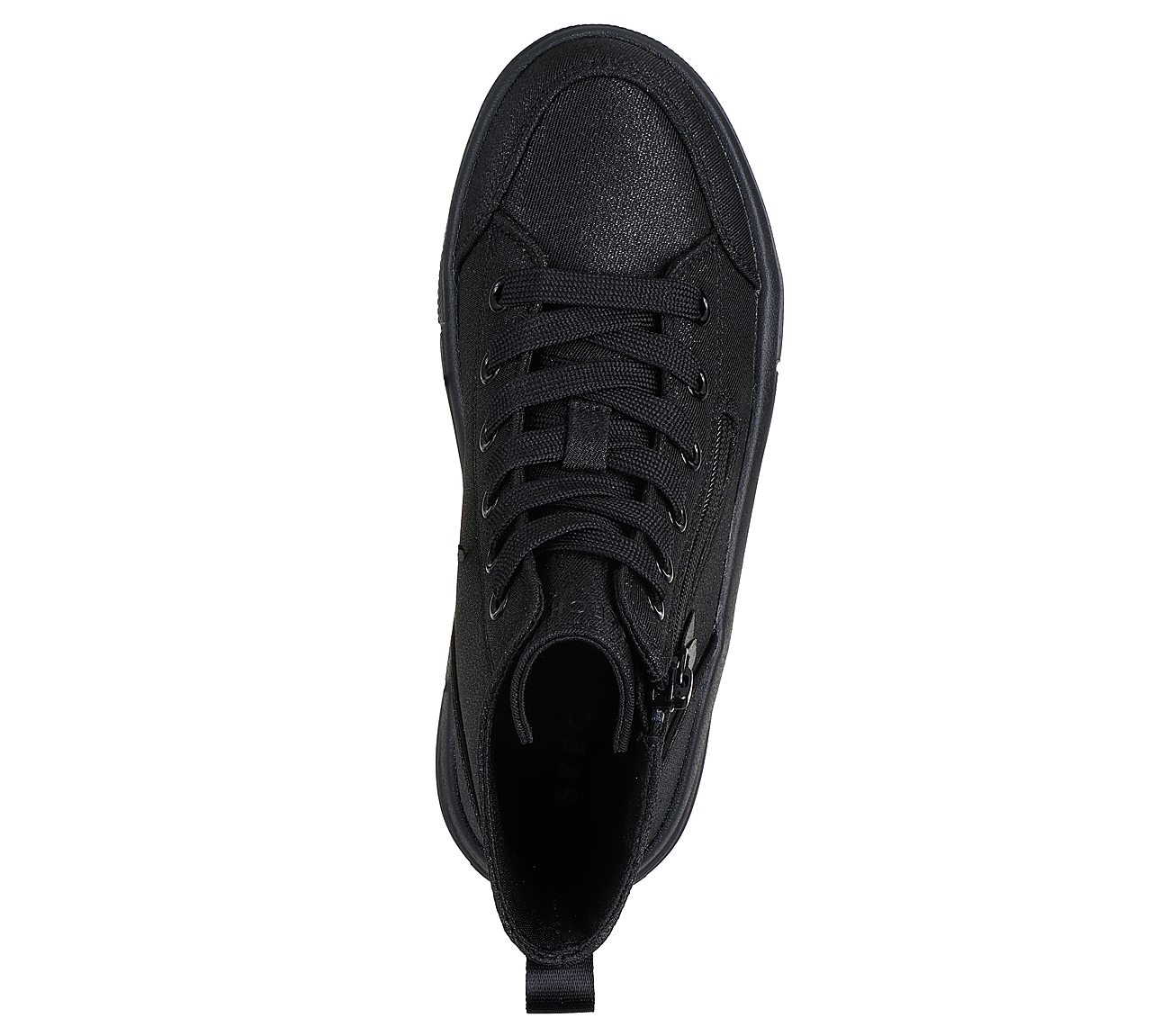 Trend upwards wearing Skechers Hyperlift. This high-top fashion sneaker features a canvas upper in a sheen finish with a lace-up front, lateral zipper, cushioned comfort insole, and a vulcanized platform bottom.
